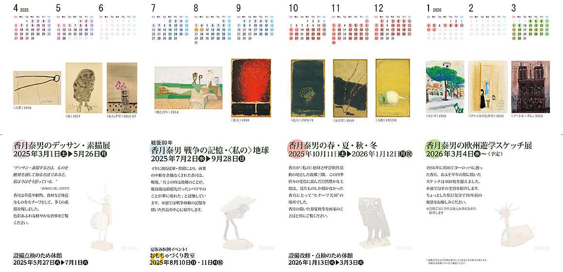 香月が<私の>地球と呼び制作活動の地とした故郷三隅。この四季折々の変化に富んだ自然豊かな土地は、見たものしか描かなかった香月にとっては”モチーフ天国”の場所でした。香月の描いた春夏秋冬を画家の言葉と共にご覧ください。
